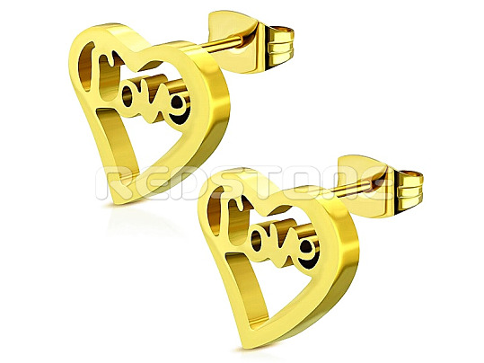Pozlacené náušnice z chirurgické oceli v lesklém provedení ve tvaru srdíčka s nápisem Love.